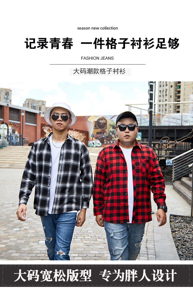 SUNTEK大码格子衬衫男长袖宽松潮牌胖子加肥加大红色春秋外穿300斤男装衬衫
